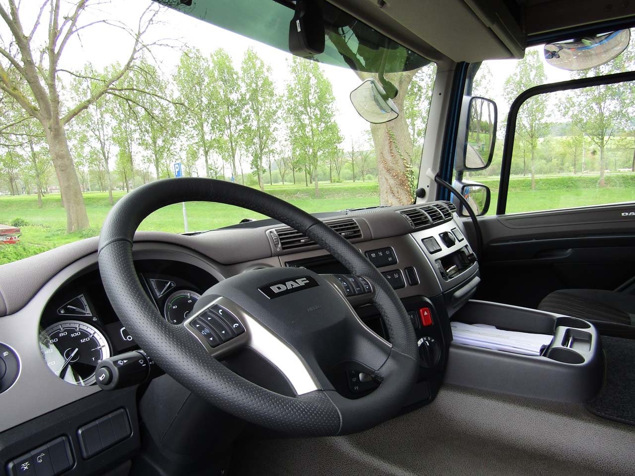 Aunque exteriormente se ha variado algo la apariencia del frontal y la visera exterior ofrece mejor aerodinámica, lo cierto es que lo realmente decisivo queda oculto a la vista exterior. Eso sí, nos agrada un detalle. DAF como fabricante también insiste en lo mismo que sus rivales. El camión sería más aerodinámico sin visera exterior, pero como los transportistas siguen prefiriendo un vehículo con este elemento han tomado la decisión de crear un nuevo perfil de la visera con la mejor aerodinámica posible.