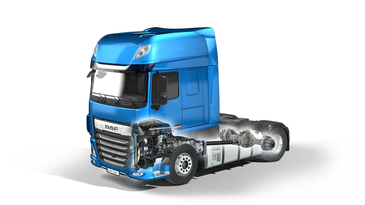 DAF ha actuado sobre sus motores PACCAR, los mismos que ofrece en otras marcas del grupo como Tatra, Kenworth y Peterbilt, introduciendo mejoras en los pistones, inyectores y la relación de compresión. Así mismo se han disminuido las pérdidas en los segmentos por fricción, compresor del aire y en la válvula EGR. Si hablamos específicamente del bloque motor de 13 litros además de los cambios anteriores que son comunes a los MX 11 y MX 13 encontraremos un nuevo turbo, nuevo árbol de levas, nueva válvula del freno motor y mejoras en el módulo de aceite. Con los cambios en el freno motor ahora resulta más efectivo a bajas rpm y ello se nota cuando circulamos, pues la combinación de las nuevas motorizaciones con la caja de cambios Traxon, también de origen ZF, hace que vayamos de media a unas 200 rpm menos que antes y por tanto se evita que cuando necesitemos retención primero debamos reducir dos o tres marchas. Esos cambios, motores que rinden mejor a menos vueltas y nueva caja de cambios de accionamiento más veloz y que puede trabajar con mayor rango de rpm, hacen que el eje motriz sea de nuevo diseño.
