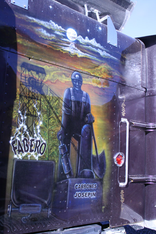 Por el momento una de las principales actividades de este Pete 379 es la de participar en la concentración anual de San Cristóbal organizada por la Asociación Cultural de San Cristóbal Fabero, que cuenta con unos 70 socios, transportistas de la zona, entre los cuales ni que decir tiene se encuentra nuestro protagonista de hoy. Eso y, de paso, homenajear a los mineros que durante décadas extrajeron el negro carbón de las entrañas de la tierra,puesto que ese ha sido el motivo elegido para decorar el Pete. Por si no resultaba suficientemente espectacular ya de origen. Queda claro que cuando uno ama su oficio tanto como Marcial todo parece poco para demostrarlo.
