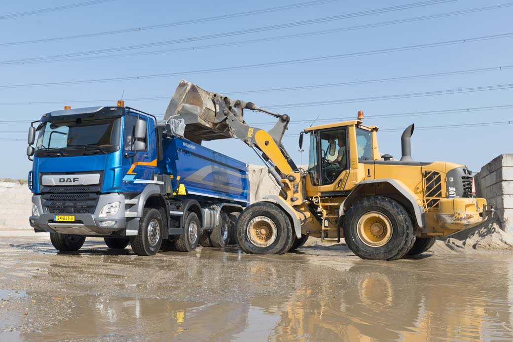 Si observamos la flota de pruebas, vemos otro DAF XF remolcador en chasis tres ejes, en este caso dedicado a la industria forestal, por lo que se ha optado por una configuración 6X4. ¿qué significa? Pues muy simple los dos ejes traseros son motrices y cuentan con la misma configuración de rueda gemela. La doble tracción es muy útil para un camión que con sus 40 toneladas totales a menudo debe acceder por caminos de tierra hasta el punto de carga enmedio del bosque. Sin abandonar la serie XF de DAF pudimos también ponernos al volante de un XF con la cabina de techo intermedio, Space Cab, y el motor Paccar MX 11 de cilindrada media en versión de 450 CV. En este caso, de nuevo un chasis tres ejes adecuado para tareas de remolcador, montamos una carrocería intercambiable con gancho hidráulico. Aquí en las operaciones de descarga y cambio de contenedor todo el peso gravita durante un momento sobre el tercer eje. Por ello se ha optado por una configuración 6X2, de nuevo sólo el segundo eje es motriz, pero el tercero arrastrado y elevable es ahora fijo, sin sistema directriz y con rueda gemela. ¿Por qué? Pues esta es la configuración más estable cuando accionamos un volquete y además la que mejor resiste la sobrecarga cuando tenemos la carrocería elevada al máximo y todavía no se ha iniciado la descarga del material.