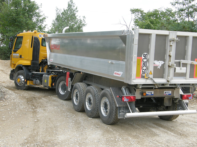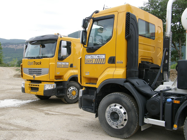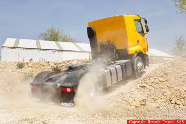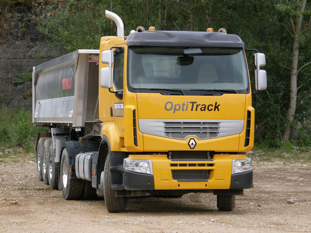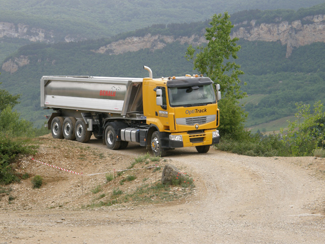 camiones para la construcción Kerax. Sin embargo, un dúmper de obras, optimizado para el trabajo extravial, cuenta con una estructura tan reforzada que cuando sale a carretera siempre adolece de menor carga útil y mayores consumos debido al rozamiento de sus neumáticos y transmisiones. De hecho, en la mayoría de las ocasiones se trabaja con dúmpers cuando realmente sus capacidades de circular por terreno accidentado no se aprovechan ni mucho menos al máximo. Será en este tipo de trabajos, donde un camión convencional 4X2 sufriría problemas y quedaría fácilmente embarrancado, pero donde realmente no se necesita un todo terreno auténtico, donde Renault Trucks propone su serie Lander y especialmente la variante dotada de tracción auxiliar hidráulica Optitrack.
