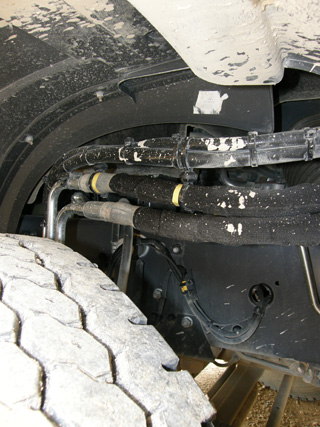 Durante nuestra prueba de contacto nos pusimos al volante de una tractora Premium Lander Optitrack, arrastraba una bañera de aluminio cargada ligeramente y sólo en la parte trasera, de modo que la tractora circulando en 4X2 se viera en apuros al encarar la primera cuesta. ¡Ah! Nuestro recorrido tuvo lugar por caminos de una vieja cantera, de modo que la adherencia distaba mucho de ser la ideal. El resultado es el previsto, en cuesta y con todo el peso atrás la tractora 4X2 no tarda en patinar y nos detenemos. LO que sucede es que disponemos de una auténtica arma secreta, la tracción Optitrack. Simplemente pulsamos una tecla en el cuadro y una figura en la pantalla nos indica que ya disponemos de tracción en el eje delantero, damos gas y el camión arranca suavemente. Ello se debe a la presencia de los motores hidráulicos, directamente montados en el buje de las llantas de las ruedas delanteras. Al pulsar el botón del cuadro hemos puesto en funcionamiento la bomba hidráulica que da presión a los motores del Optitrack, utilizando el mismo líquido del circuito hidráulico con el que se acciona el volquete. La única diferencia de otra tractora con sistema hidráulico es un sistema de ventilación para evitar sobrecalentar el mecanismo. Además, para evitar ese tipo de problemas la tracción hidráulica del eje delantero se desconectará automáticamente de nuevo en cuanto alcancemos los 30 Km/h.