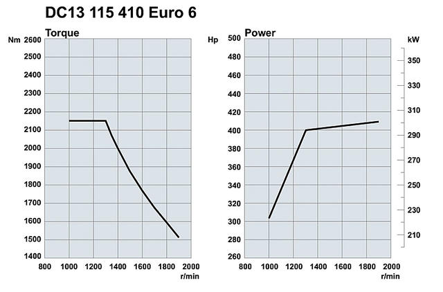 Motor: Scania DC 13 115 410 Euro 6. Seis cilindros en línea, 12,7 litros de cilindrada. Inyectores unitarios PDE y sistema SCR de tratamiento de gases de escape. Potencia máxima de 410 CV a 1900 rpm, par motor máximo de 2.150 Nm desde 1.000 rpm hasta 1.300 rpm. (POTENCIA MÁXIMA SIN SUPERAR LAS 1.300 RPM DE LA ZONA ECONÓMICA DE FUNCIONAMIENTO 400 CV) Freno motor a los gases de escape de 256 kw de potencia máxima a 2.400 rpm.
