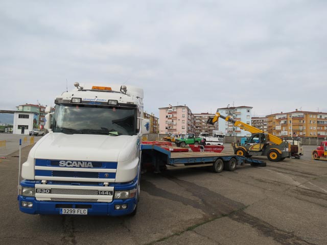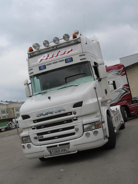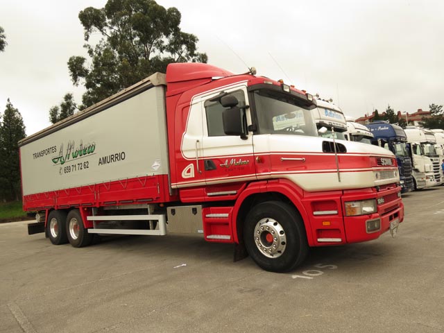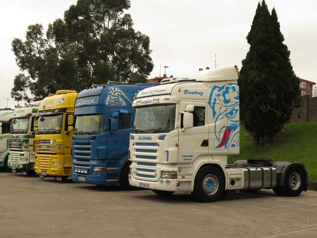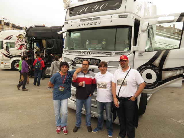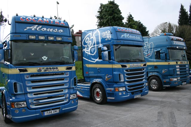 Galano, Iglesias y Poyo frente al impecable Scania de Transportes Poyo.