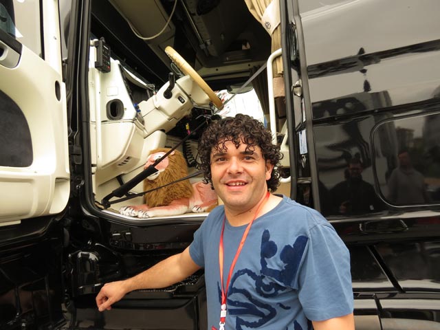 descubrimos el Scania de el navarro El Poyo, bien escoltado por los extremeños Iglesias y Galano, con sus respectivos y negros DAF y Scania. Iglesias destacaba orgulloso: “Puedes decir que este es el primer DAF New XF 510 en llegar a España que no es de color naranja.” Y es que el de Montehermoso permanece tan fiel a DAF como al color negro en sus tractoras…