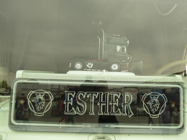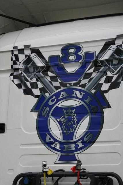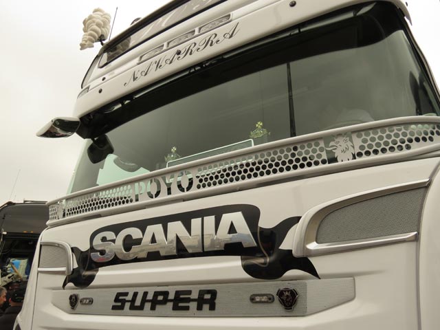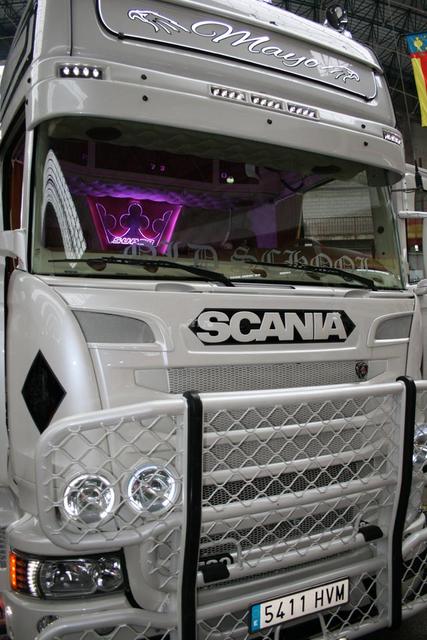 acción, dado que junto a un New DAF XF equipado con muchos de los productos de personalización de esta firma, se estaba trabajando sobre el Scania Serie R 730 del transportista leonés Mayo. Una tractora que habiéndola vista sin terminar ya nos pareció tremendamente espectacular.