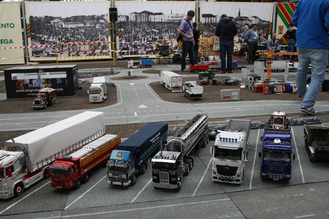 camiones en miniatura de radio control, donde se pudieron comparar modelos tan dispares como miniexcavadoras, modernos Actros junto a otros camiones de RC que reproducen antiguos modelos Pegaso, como un espectacular cuatro ejes Pegaso cuyo eje arrastrado también es directriz. Toda una joya del especialista Cántabro Sunsundegui.